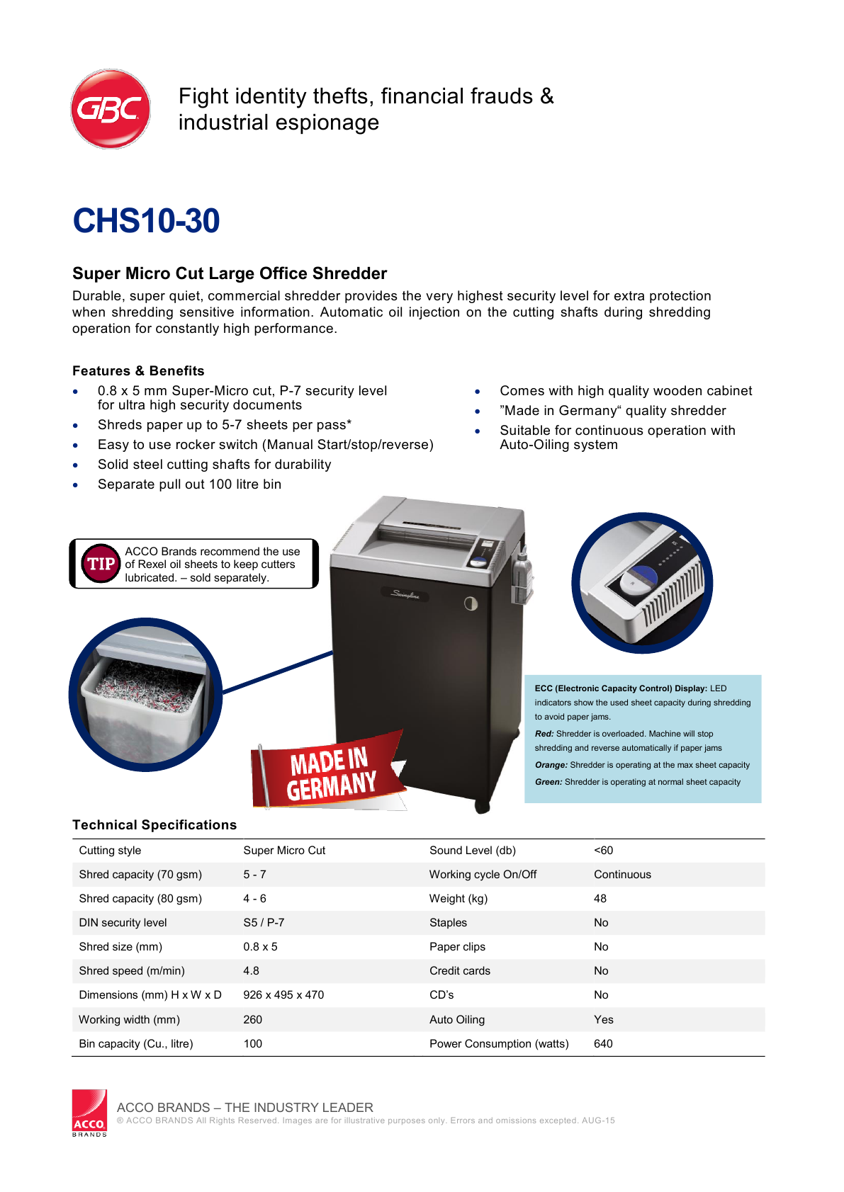*SPS(安全保護系統)包裝:電子控制,透明安全蓋在入紙口作為附加安全元件;自動反轉和電源切斷(避免卡紙);如果垃圾箱已滿,則自動停止;通過磁性開關作電子門鎖保護;雙馬達保護;節能模式(ESM)自動待機並在1小時後關閉電源