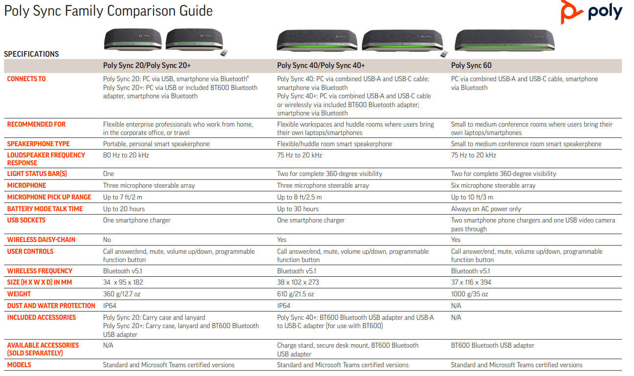 • Poly Sync 40+ connects wirelessly to computers via the included BT600 adapter
